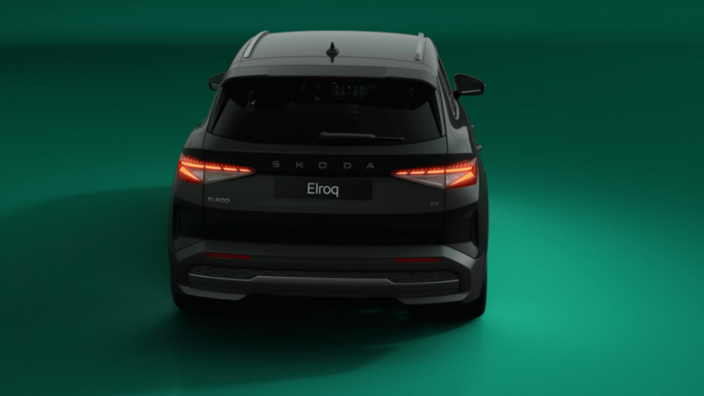 At the front, the Elroq wears sharp DRLs, muscular lines on the bonnet, and sculpted air inlets that improve aerodynamics — something that’s crucial for EV efficiency. From the sides, it carries the typical Skoda stance, simple and confident, while the rear looks clean with crystalline LED tail lamps and bold SKODA lettering across the boot.