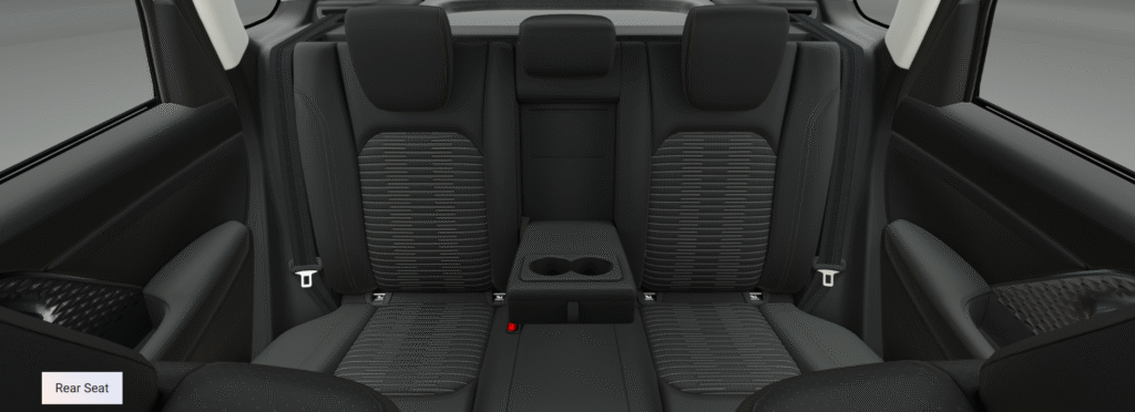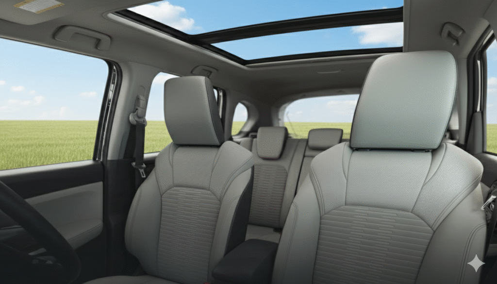 The seats combine fabric and leatherette, offering both comfort and ventilation. The driver’s seat is power-adjustable, and the cabin lighting can be personalized through ambient LED options.
